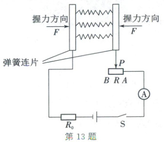 13. (2025·自贡)如图为初中体育均衡检测中握力计的工作原理简图,电源电压恒为 3 V,R 的阻值大小与其连入电路的长度成正比,R₀ 为保护电阻,弹簧电阻不计。握力 F 为零时,P 在 A 端;握力 F 最大时,P 在 B 端。P 从 A 端滑至 B 端过程中,弹簧的弹性势能将