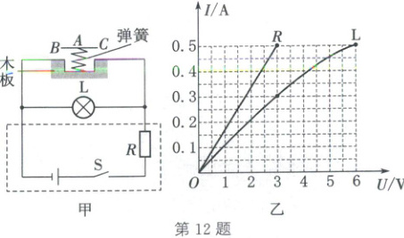 12. (2025·长春)科创小组为学校科技周展会设计了一款提示器,可以提示展台上有无展品。图甲是该提示器的原理图,展台的结构由木板、弹簧、阻值不计的金属片(A、B、C)以及提示电路组成,A 可将 B、C 接通或断开。工作时,闭合开关 S,通过提示灯 L 是否发光可判断展台上有无展品。提示灯 L 和电阻 R 的 I-U 图像如图乙所示,电源电压恒定,提示灯 L 的额定电压为 6 V,实际电压不低于 3 V 即可达到亮度要求。