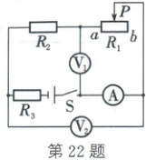 22. (2025·安徽)如图所示的电路中,电源电压保持不变,$ R_1 $ 为滑动变阻器,$ R_2 $ 和 $ R_3 $ 为定值电阻。闭合开关 $ S $,在保证电路元件安全的前提下,将滑动变阻器的滑片 $ P $ 由 $ b $ 端移至 $ a $ 端,电压表 $ V_1 $、电压表 $ V_2 $、电流表 $ A $ 示数变化量的绝对值分别为 $ \Delta U_1 $、$ \Delta U_2 $、$ \Delta I $。则(