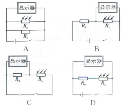 25. (2025·连云港)某兴趣小组想设计一种能自动测定光照强度的装置,当光照强度增强时,光敏电阻 $ R_x $ 阻值变小,光照强度显示器(由电压表改装而成)示数增大,反之示数减小。若电源电压不变,$ R_0 $ 是定值电阻,则下列设计的电路图中符合要求的是(