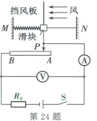 24. (2025·德阳)如图所示为测风速仪的工作原理简化图,装有挡风板和滑片 $ P $ 的轻质滑块与轻质弹簧套在滑杆 $ MN $ 上,弹簧左端固定,右端与滑块相连,$ R_0 $ 为定值电阻,$ AB $ 为电阻丝,滑片 $ P $ 与电阻丝 $ AB $ 接触良好。无风时,滑片 $ P $ 在 $ A $ 处;有风时,滑块与滑片 $ P $ 一起向左移动。闭合开关 $ S $,当风速增大时下列分析正确的是(