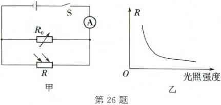 26. (2025·福建)光照强度会影响花卉生长。图甲为光照强度过大时触发报警的电路,电源电压不变,$ R_0 $ 为阻值可调的电阻箱,$ R $ 为光敏电阻,其阻值随光照强度变化关系如图乙。当电流表示数大于某一值 $ I_0 $ 时触发报警,$ I_0 $ 时的光照强度为警戒光照强度。闭合开关 $ S $,下列说法正确的是(