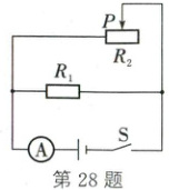 28. (2024·内江)在如图所示的电路中,电源电压恒为 $ 12 \, V $,定值电阻 $ R_1 $ 的阻值为 $ 5 \, \Omega $,滑动变阻器 $ R_2 $ 标有“$ 50 \, \Omega \ \ 2 \, A $”的字样,电流