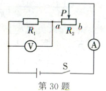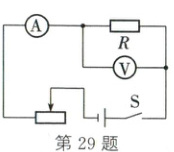 29. (2024·临沂)如图所示电路的电源电压为 $ 9 \, V $,电流表使用 $ 0 \sim 0.6 \, A $ 量程,电压表使用 $ 0 \sim 3 \, V $ 量程,阻值为 $ 10 \, \Omega $ 的定值电阻 $ R $ 允许通过的最大电流为 $ 0.5 \, A $。为保证电路中各元件安全工作,滑动变阻器的最大阻值应大于(