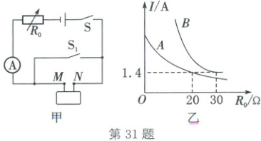 31. (2024·泰州)电子技师社团活动中小明对一个暗箱进行研究。暗箱表面有两个接线柱 $ M $、$ N $,内部只接有 $ R_1 $ 和 $ R_2 $ 两个定值电阻,$ R_1 $ 阻值为 $ 6 \, \Omega $,$ R_2 $ 阻值未知。小明用图甲所示的电路(电源电压不变)进行实验,在 $ S $、$ S_1 $ 都闭合和 $ S $ 闭合、$ S_1 $ 断开的两种情况下,改变电阻箱 $ R_0 $ 的阻值,读取电流表示数 $ I $,绘制了如图乙所示的 $ I $ 随 $ R_0 $ 变化的曲线。下列判断中正确的是(
