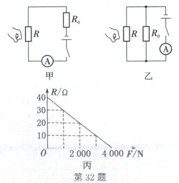 32. (2025·泸州)(多选题)物理应用无处不在。如图甲、乙所示是拳击训练中为测量击打力大小而设计的电路,电源电压恒为 $ 6 \, V $,$ R_0 $ 为 $ 20 \, \Omega $ 的定值电阻,电流表量程为 $ 0 \sim 0.6 \, A $,$ R $ 为压敏电阻,其电阻值 $ R $ 与击打力 $ F $ 的关系如图丙所示。下列说法中正确的是(