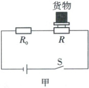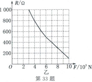 33. (2025·云南)(多选题)某种用于检测大件货物质量的装置,其简化电路如图甲所示。电源电压为 $ 12 \, V $,电路中允许通过的最大电流为 $ 30 \, mA $。定值电阻 $ R_0 $ 有 $ 100 \, \Omega $ 和 $ 200 \, \Omega $ 两种规格,$ R $ 为力敏电阻,其阻值与压力 $ F $ 的关系如图乙所示。$ R $ 上方有一质量不计的绝缘平板,检测时将货物置于其上。下列说法正确的是($ g $ 取 $ 10 \, N/kg $)(