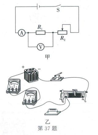 37. (2025·苏州)小明用电压为6V的电源、定值电阻R₁、电压表、电流表、最大阻值为20Ω的滑动变阻器R₂、开关等器材,探究导体中的电流与导体两端电压的关系。