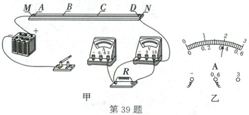 39. (2025·河北)在“探究电流与电压的关系”的实验中,小明设计了图甲所示的实验电路。电源电压为6V不变,R为定值电阻,AD间粗细均匀的电阻丝和夹子(M和N)一起组成变阻器,A、B、C、D、E、F为电阻丝上的六个点,E、F两点未标出。