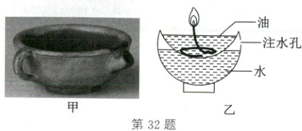 32. (2024·北京)图甲为我国古代的“节能灯”——“省油灯”,图乙为其部分剖面示意图。向灯盏夹层内注水,有助于减慢油的蒸发,达到省油的目的。关于“省油灯”减慢油蒸发的方法,下列说法正确的是 (