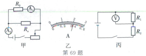 69. (2025·大庆)小娜同学设计了如图甲所示的电路图,来测量未知电阻$R_{x}$的阻值。已知定值电阻$R_{0}$的阻值为$20\Omega$,电源电压低于$10V$。