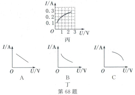 (4) 经过多次实验,测量并记录多组数据,得到小灯泡的$I-U$图像如图丙所示,该图像不是一条直线,其原因是______。接下来,小组成员又对实验过程中通过滑动变阻器的电流与其两端的电压的关系进行了思考,根据图丙大致画出了滑动变阻器的$I-U$图像。图丁为三位同学画出的图像,其中正确的是______(填“A”“B”或“C”),你判断的理由是______。