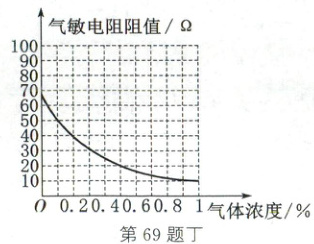 (4)从图丁可知,气体浓度增大,气敏电阻的阻值变小,电流变大,由U =
