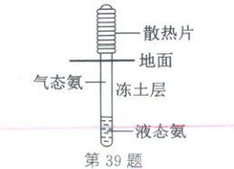 39. (2025·北京)在青藏铁路工程中,为了保证多年冻土区路基的稳定性,铁路两侧竖立了许多热棒。如图所示,热棒是封闭的中空长棒,下端插在冻土中,上端装有散热片,里面填充低沸点的液态氨作为“制冷剂”。在寒冷的季节,空气温度低于冻土层温度,制冷剂作为热的“搬运工”,通过液态氨与气态氨的相互转化,使冻土层温度降低、厚度增加,这样即使到了暖季热棒不再工作,冻土也不会完全融化,冻土层因温度变化对路基产生的影响变小。关于热棒在工作过程中,下列说法正确的是 (