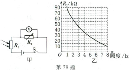 78. (2025·成都)教室灯光改造需要检测室内光照强度(简称照度,单位为$\mathrm{l}\mathrm{x}$)。小成利用身边器材设计了一个测量照度的电路,如图甲所示。电源电压取值范围是$0\sim12\mathrm{V}$;电压表量程是$0\sim3\mathrm{V}$;$R_{1}$为阻值范围是$10\mathrm{k}\Omega\sim30\mathrm{k}\Omega$的电阻箱;$R_{2}$为光敏电阻,其阻值随照度变化的规律如图乙所示。