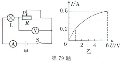 79. (2025·河北)如图甲所示,电源电压不变,滑动变阻器$R$标有“$50\Omega$ $1\mathrm{A}$”字样,小灯泡$L$标有“$6\mathrm{V}$ $0.5\mathrm{A}$”字样。闭合开关,当滑片$P$在某一位置时,电压表示数为$2\mathrm{V}$,电流表示数为$0.5\mathrm{A}$,小灯泡$L$的$I-U$图像如图乙所示。