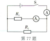 77. (2025·吉林)如图所示的电路中,电源电压恒定,$R_{2}$的阻值为$15\Omega$。闭合开关$S$,电流表$A$的示数为$1.2\mathrm{A}$,电流表$A_{1}$的示数为$0.4\mathrm{A}$。求: