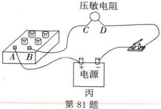 (2) ① A、B ② 电压表量程为 0~3 V,故电压表最大示数为 3 V;根据串联电路电压规律,压敏电阻两端电压 U_压 = U - U_0 = 4.5 V - 3 V = 1.5 V,由分压原理可知, $\frac{R_压'}{R_0} = \frac{U_压}{U_0}$,即 R_压' = $\frac{U_压}{U_0}$ · R_0,代入数据得 R_压' = $\frac{1.5 V}{3 V}$ × 500 Ω = 250 Ω,由图乙可知,此时压力 F = 40 N,则钢片最大下垂量 h = $\frac{F}{k}$ = $\frac{40 N}{2 N/mm}$ = 20 mm ③ 要增大电路所能测量的钢片最大下垂量,即钢片受到的压力变大,由图乙可知,压敏电阻的阻值变小,根据 R_压 = $\frac{U - U_0}{U_0}$ · R_0 可知,可以改进的措施为减小 R₀ 的阻值或减小电源电压