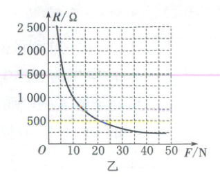 ②电压表量程为 0~3 V,故电压表最大示数为 3 V;根据串联电路电压规律,压敏电阻两端电压 U_压 = U - U_0 = 4.5 V - 3 V = 1.5 V,由分压原理可知, $\frac{R_压'}{R_0} = \frac{U_压}{U_0}$,即 R_压' = $\frac{U_压}{U_0}$ · R_0,代入数据得 R_压' = $\frac{1.5 V}{3 V}$ × 500 Ω = 250 Ω,由图乙可知,此时压力 F = 40 N,则钢片最大下垂量 h = $\frac{F}{k}$ = $\frac{40 N}{2 N/mm}$ = 20 mm
