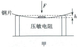 81. (2024·南京)科技小组利用钢片和压敏电阻,做“模拟钢梁承重下垂量测试”的实验,如图甲所示,不计压敏电阻和钢片的自重,已知压敏电阻受到的压力$F$与钢片下垂量$h$满足关系$F=kh$,$k=2\mathrm{N}/\mathrm{m}\mathrm{m}$。图乙是压敏电阻阻值$R$与$F$关系图像。图甲中压敏电阻与电源、电阻箱和开关组成图丙所示电路,电源电压为$4.5\mathrm{V}$,电阻箱阻值设定为$R_{0}=500\Omega$。