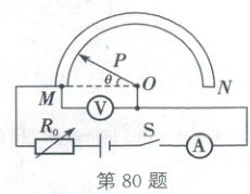 80. (2024·宿迁)新房装修时,工人经常用普通量角器测量一些角度,不方便读数。小明根据所学的知识设计了电子量角器,电路如图所示,电流表的量程为$0\sim0.6\mathrm{A}$,电压表的量程为$0\sim3\mathrm{V}$,$O$为半圆弧电阻$MN$的圆心,金属滑片$OP$为半径,与半圆弧接触良好,接入电路的电阻$R_{MP}$与指针旋转角度$\theta$成正比,电源电压恒为$6\mathrm{V}$,$R_{0}$为电阻箱。将滑片$OP$旋转至$M$处,调节$R_{0}$的阻值,使电路中电流为$0.6\mathrm{A}$。