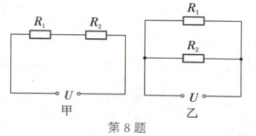8. (2025·绥化)如图所示,电源电压恒定,将定值电阻 R₁、R₂ 按图甲、图乙两种方式接入电路,电阻 R₁ 在两电路中消耗的电功率分别为 4 W 和 9 W,则 R₁:R₂=