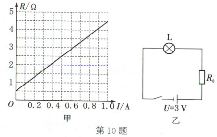 10. (2025·镇江)某种灯泡的电阻 R 与电流 I 关系如图甲所示,当两个该种灯泡串联接在电压恒为 U₀ 的电源上时,通过灯泡的电流为 1 A,此时灯泡电阻为