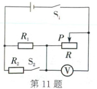 11. (2025·凉山)在如图所示的电路中,电源电压恒定,电压表量程为 0~15 V,定值电阻 R₁、R₂ 的阻值分别为 10 Ω 和 20 Ω。当只闭合开关 S₁,将滑动变阻器 R 的 1/3 阻值接入电路时,电压表示数为 3 V,电阻 R₁ 的电功率为 P₁;当闭合开关 S₁、S₂,将滑动变阻器滑片 P 移到最左端时,定值电阻 R₂ 的电功率为 P₂。若 P₁:P₂=1:8,则电源电压为