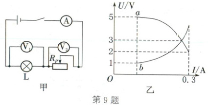9. (2025·遂宁)某同学用图甲所示的电路来测量小灯泡的电功率。他闭合开关,将滑动变阻器滑片从最右端向左滑动,直到灯泡电压达到额定值,记录了不同时刻三个电表的示数,并在同一坐标图中分别绘制了 L 和 Rₚ 的 U - I 图像如图乙。