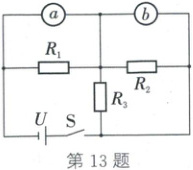 13. (2025·南充)如图所示,当 a 处接电流表,b 处接电压表,闭合开关 S,电路总功率为 P₁;当 a、b 两电表互换位置后,再闭合开关 S,电路总功率为 P₂。已知:U=6 V,R₁=20 Ω,R₂:R₃=1:3,P₁:P₂=4:3,则 R₂ 的阻值为