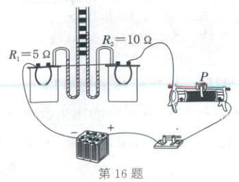 16. (2025·广东)如图所示实验,实验前已调好器材,实验过程中通过电阻 R₁、R₂ 的电流