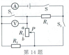 14. (2025·达州)如图所示,电源电压恒为 U。只闭合开关 S,滑片 P 移至 a 端,此时电压表示数为 U₁,电流表示数为 I₁,R₃ 消耗的电功率为 P₁;滑片 P 移至 b 端,电压表示数为 U₂,电流表示数为 I₂,R₃ 消耗的电功率为 P₂;开关 S、S₁ 和 S₂ 全部闭合,滑片 P 仍位于 b 端,R₁ 消耗的电功率为 P₃,电流表示数为 I₃。已知 I₃=1.4 A,P₃=3.6 W,U₁:U₂=5:8,P₁:P₂=25:4。电源电压 U=