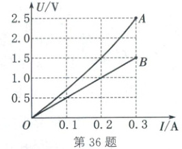 36. (2025·达州)如图所示为定值电阻 R 和灯泡 L 的 U-I 图像,灯泡 L 额定电压为 2.5 V。将两用电器串联在电源两端,灯泡 L 正常发光。下列说法正确的是(