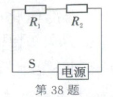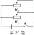 39. (2025·新疆)如图所示,电路中电源电压为 6 V,R₁、R₂均为滑动变阻器。闭合开关 S 后,调节滑动变阻器的滑片,使电路的总功率为 5.4 W 时,发现无论怎样改变滑动变阻器的阻值,两个滑动变阻器接入电路中的电阻之差的最大值为 10 Ω。则 R₁、R₂两个滑动变阻器的最大阻值可能为(