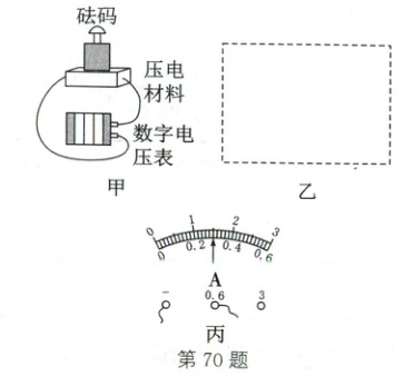 70.(2025·威海)压电材料是一种在发生弹性形变时将机械能转化为电能的新型材料。为探究影响压电材料两端电压大小与压力大小、材料种类的关系,科技小组利用如图甲所示装置设计了如下实验:将质量不同的砝码分别放在压电材料a、b的中心,用数字电压表测量压电材料两端的电压,记录数据如表所示。