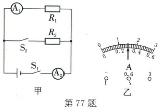77.(2025·德阳)在如图甲所示的电路中,电源电压保持不变,电阻R1的阻值为20Ω。闭合开关S1,断开开关S2,电流表A1的示数如图乙所示;闭合开关S1和S2,电流表A2的示数为1.2A,求: