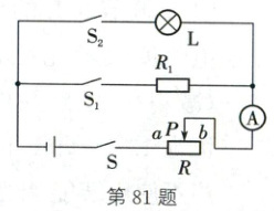 81.(2025·乐山)如图所示,电源电压恒定,灯泡L标有“6V 6W”字样(忽略温度对灯丝电阻的影响),滑动变阻器R的最大阻值为20Ω。当S、S1、S2均闭合,滑动变阻器滑片移至a端时,灯泡正常发光,此时电流表示数为1.6A。求: