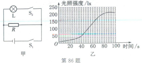 (4) 为了节约用电,兴趣小组的同学将开关$S_{2}$更换为光敏开关,当光照强度大于50lx时,开关会自动断开(光照强度是指单位面积上所接受可见光的光通量)。假设某时段火星表面的光照强度随时间的变化如图乙所示,则0~100s内航天服消耗的电能是多少?