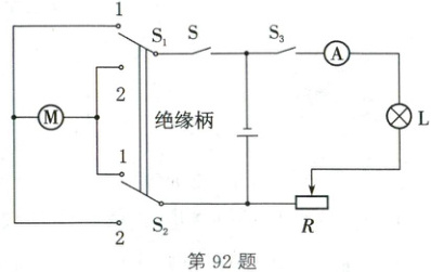 92. (2025·威海)采摘机器人在智慧农业中广泛使用,兴趣小组设计的某采摘机器人部分工作原理如图所示,可以"前进""后退""照明";开关$S_{1}$、$S_{2}$用绝缘柄相连,可同时连接触点1或2,电动机均正常工作。部分元件参数:电动机(24V 96W),灯泡L(18V 5.4W),滑动变阻器R(50Ω 1A),电流表(0~0.6A)。