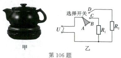 106. (2025·宜宾)中医药是中国传承几千年的文化瑰宝。如图甲是一款小型的电热中药煎药壶,额定电压为220V,有高温、低温两个挡位,其内部简化电路如图乙所示,当双触点选择开关接触A、B时为断开状态。$R_{1}$、$R_{2}$是两个阻值不变的电热丝,$R_{1}=484Ω$,$R_{2}=121Ω$,$U=220V$。