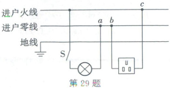 29. (2025·达州)如图为小超家部分电路示意图。他闭合开关 S,灯泡正常发光;将电热水壶插头插入插座,正常工作一段时间后,灯泡突然熄灭;马上取下电热水壶,灯泡仍不发光。经检查空气开关未跳闸,用测电笔检测 a、b、c 三点氖管均发光。下列电路故障判断正确的是 (