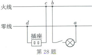 28. (2025·绥化)如图是家庭电路的一部分,进户线在图中左侧。闭合开关,灯泡不亮,用测电笔检测发现 a、b、c 三处氖管发光,d 处氖管不发光,则电路故障是 (
