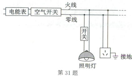 31. (2024·武汉)如图所示为某同学家部分家庭电路的示意图。电能表上标有“220 V 10(40)A”的字样,他家正在使用的所有用电器总功率为 6 kW,其中电饭煲的功率为 1.5 kW,饭煮熟后,他将这个电饭煲插头从插座中拔出,再将功率为 1 kW 的电热水壶插头接入插座中,其他用电器仍正常工作,闭合电热水壶上的开关,空气开关跳闸。空气开关跳闸的原因可能是 (