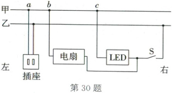 30. (2024·广州)如图所示,某家庭电路的输电线甲、乙从右端进户。闭合开关 S,LED 灯发光、电扇正常工作,用测电笔检测插座,只有检测右孔时氖管发光。由于出现故障,电扇停止工作,LED 灯仍发光,用测电笔检测插座两孔,氖管均发光。该故障是 (