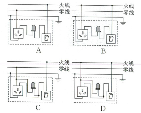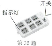 32. (2025·乐山)小明在使用如图所示插线板的过程中发现:在开关断开时,插线板上的指示灯不发光,插孔不能提供工作电压;在开关闭合时,指示灯发光,插孔可以提供工作电压;如果指示灯损坏、开关闭合时插孔也能提供工作电压。根据上述现象,下列电路连接方式合理的是 (