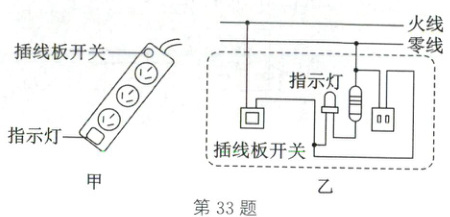 33. (2025·武汉)图甲是一个常用的插线板,图乙是其内部元件连接的示意图。将一盏台灯插头插入插线板的插孔内,闭合插线板开关和台灯开关,台灯正常发光。下列说法正确的是 (