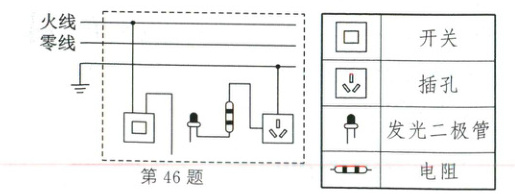 46. (2024·兰州)小明在使用插线板时发现:插线板上的开关断开时,指示灯不发光,插孔断电;开关闭合时指示灯发光,插孔通电;如果指示灯损坏,开关闭合时插孔照样可以通电。如图,虚线框内为插线板内部电路简化示意图,请按上述要求用笔画线代替导线将插线板内部电路中的缺失部分补画完整。