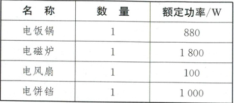 (2)插线板允许通过的最大负载功率P = UI = 220\ V × 10\ A = 2200\ W;已经接入的电饭锅和电风扇的功率P' = P₁ + P₂ = 880\ W + 100\ W = 980\ W;在保证插线板安全使用的条件下,还可以再接入一个用电器的最大功率P₀ = P - P' = 2200\ W - 980\ W = 1220\ W;依题意还可以接入一个电饼铛,此时电路中的实际总功率$P_{总} = P₁ + P₂ + P₃ = 880\ W + 100\ W + 1000\ W = 1980\ W。$干路中的实际总电流$I_{总} = \frac{P_{总}}{U} = \frac{1980\ W}{220\ V} = 9\ A。$