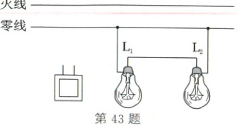 43. (2024·凉山)家庭电路中,灯L₁与L₂并联,开关同时控制两盏灯,请用笔画线代替导线将开关接入电路中使两灯泡正常发光。