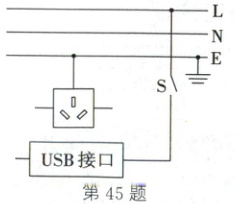 45. (2024·达州)现代家庭生活中,很多插线板都带有USB充电口,能直接为手机充电。请将电路图补充完整。要求:开关S控制整个电路;S闭合后,该电路既能给手机充电,同时又不影响为其他家用电器供电。